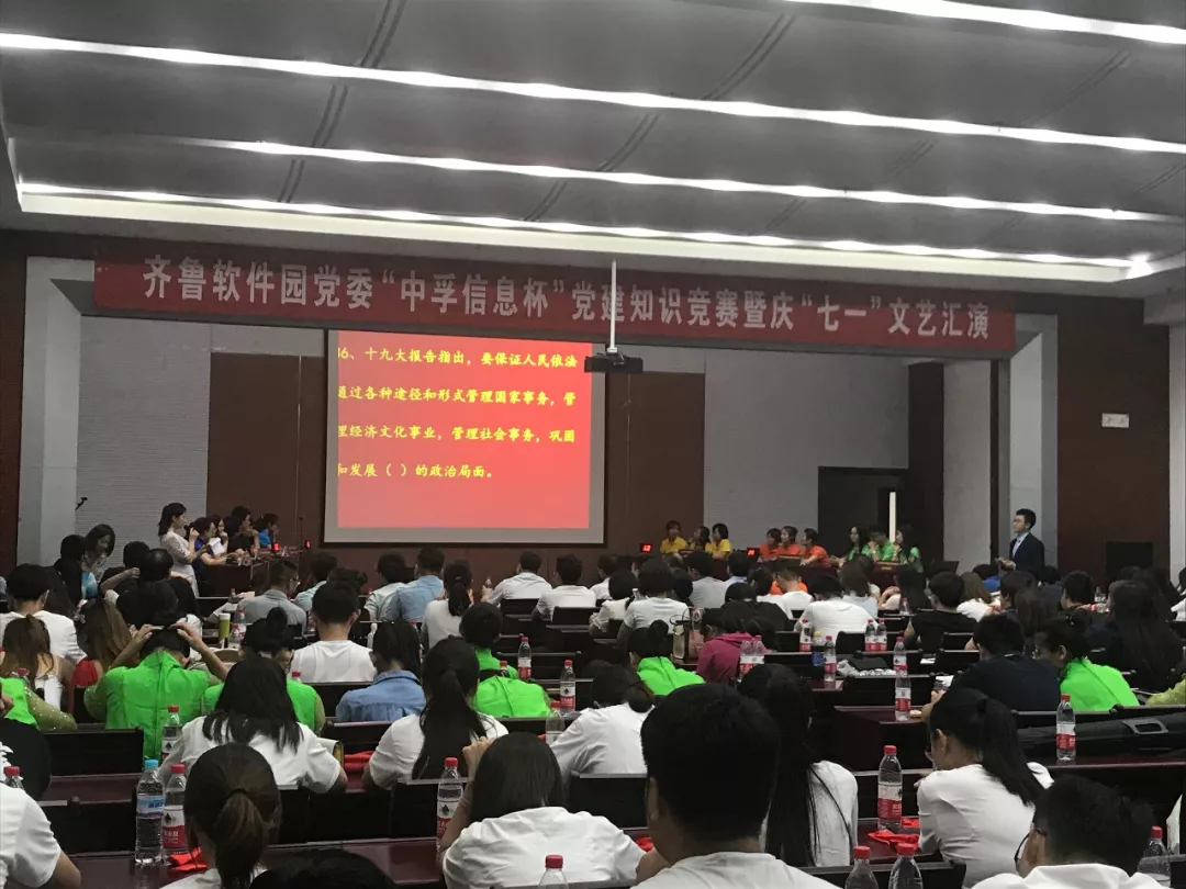 为庆祝中国共产党创建97周年,深入推进党的十九大精神学习,2018年6月30日下午,J9集团官网信息党总支响应齐鲁软件园党委号召,组织并参与了“J9集团官网信息杯”党建知识竞赛暨庆“七一”文艺汇演活动,为党的97岁华诞献礼。园区企业联合党委下属企业党组织成员、党建指导员等200余人参加了此次活动。